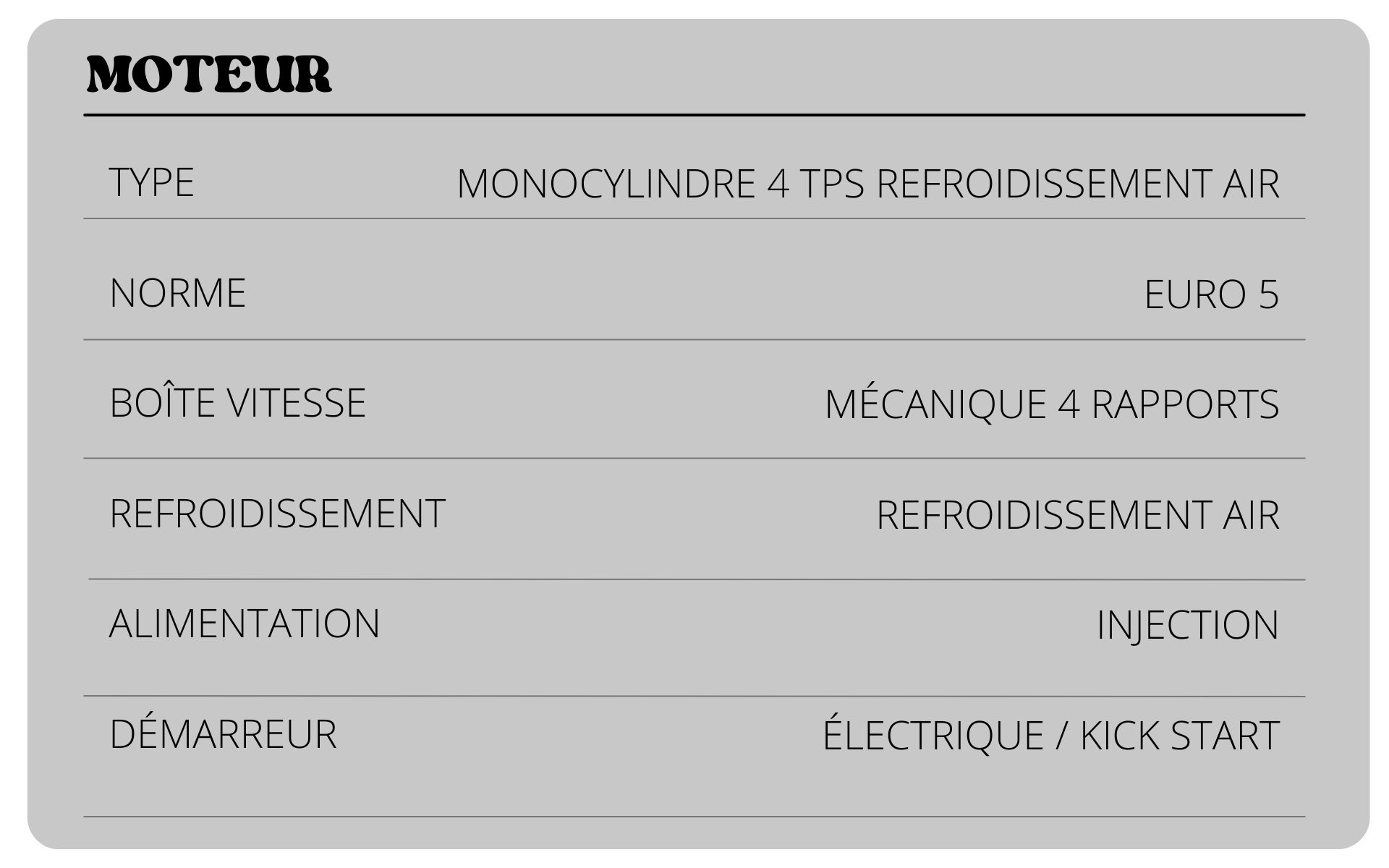 Dotée d’un moteur 4 temps de 50 cm³, la F66 est conforme aux dernières normes EURO 5, garantissant ainsi une faible émission de polluants tout en offrant une conduite souple et économique. Son moteur à injection assure un démarrage efficace et une meilleure gestion de la consommation de carburant, avec seulement 1,6 litre aux 100 km. La boîte de vitesses mécanique à 4 rapports permet une conduite dynamique et adaptée à tous types de parcours.