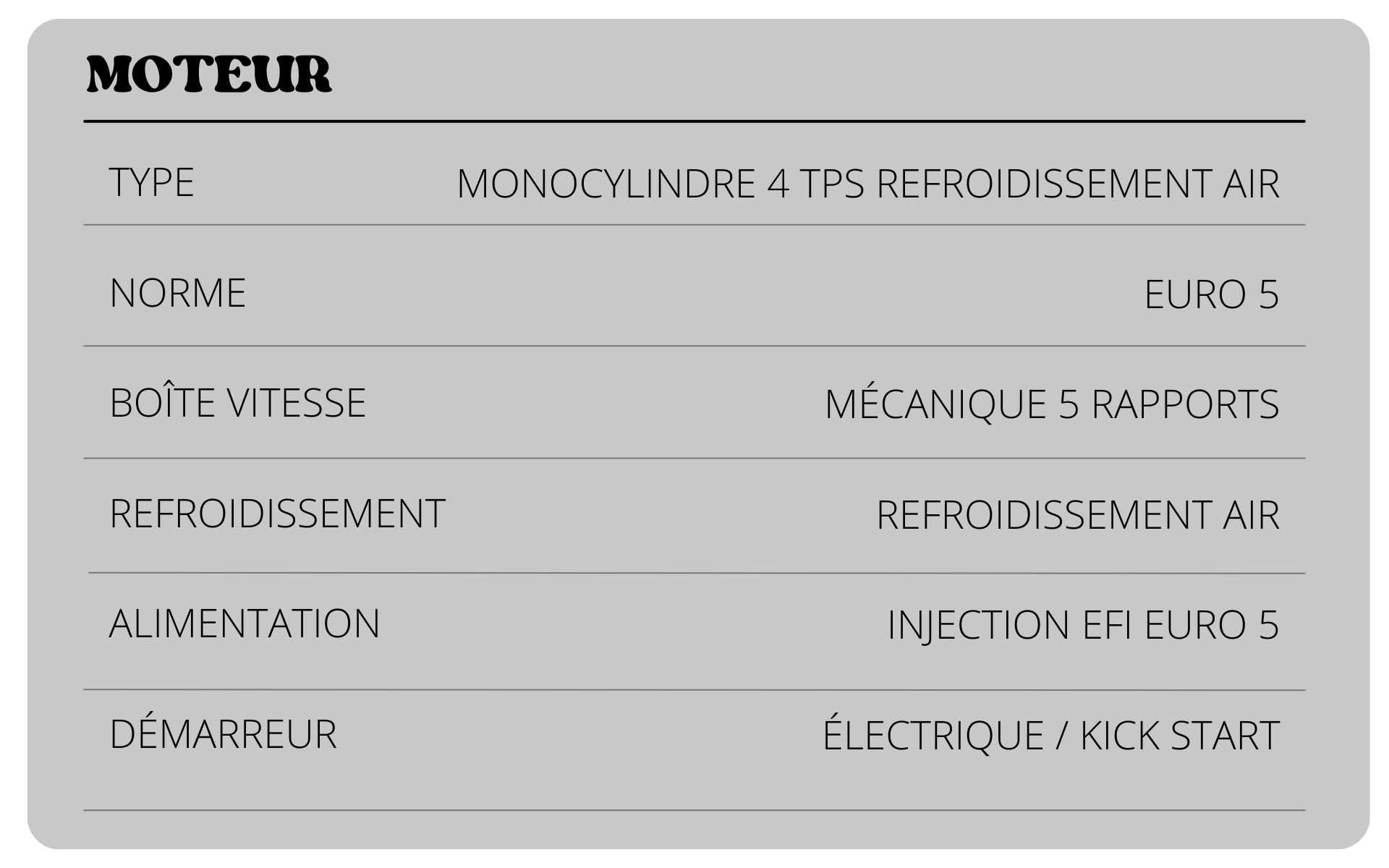 Équipée d’un moteur monocylindre 4 temps 49,9 cm³ homologué Euro 5, cette moto 50cc neuve offre des performances équilibrées, une combustion propre et un excellent rendement au quotidien. Robuste et peu polluante, elle demande très peu d’entretien, ce qui en fait un choix idéal pour un premier deux-roues.