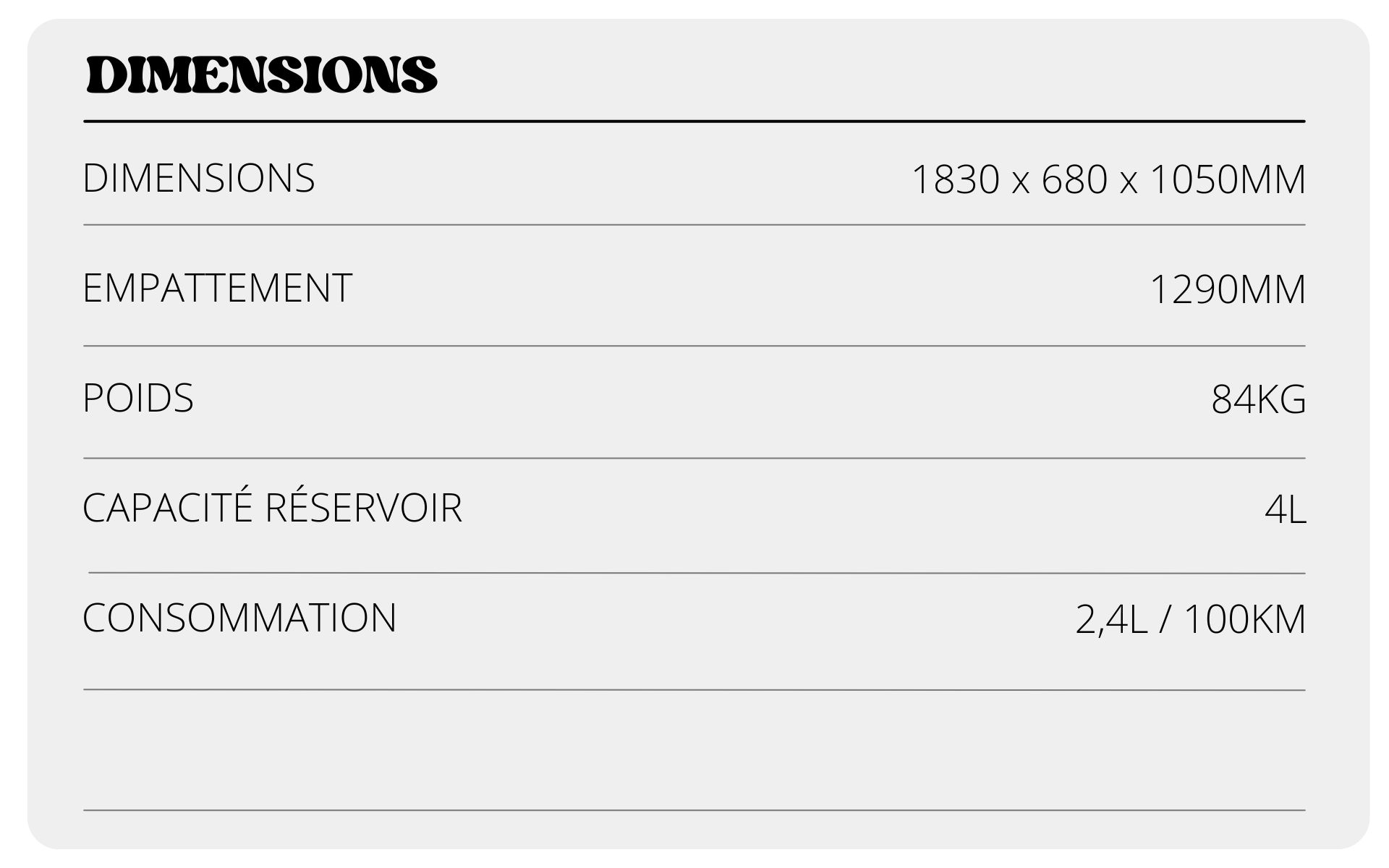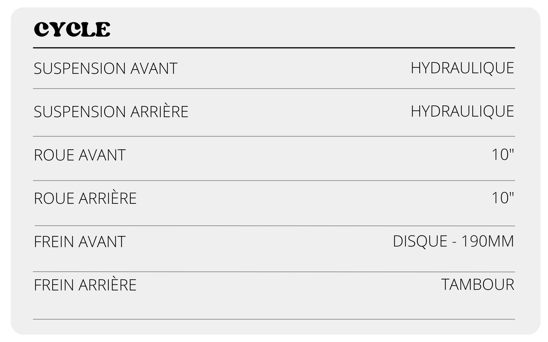 Compact et maniable grâce à ses roues de 10 pouces, le Sunny se faufile facilement en ville et se gare sans difficulté. Sa hauteur de selle de 800 mm assure une position de conduite confortable et accessible à la majorité des gabarits. Il dispose de deux béquilles, centrale et latérale, facilitant le stationnement au quotidien.